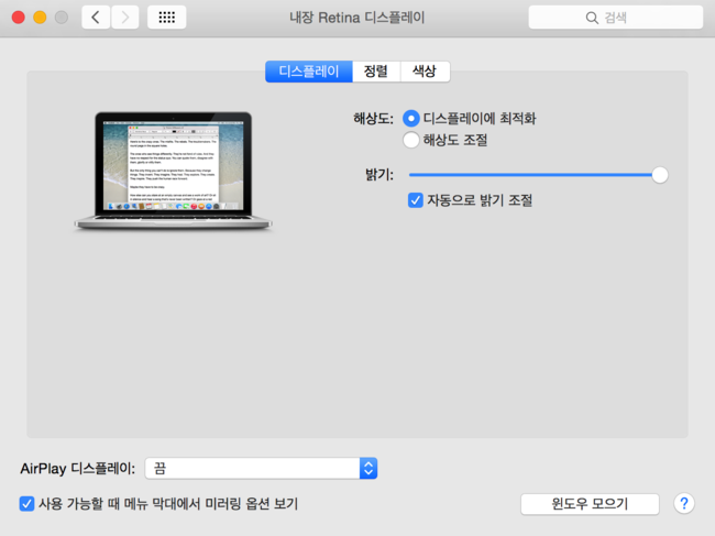 시스템 환경설정 > 디스플레이 항목에서 [자동으로 밝기 조절]을 체크하고