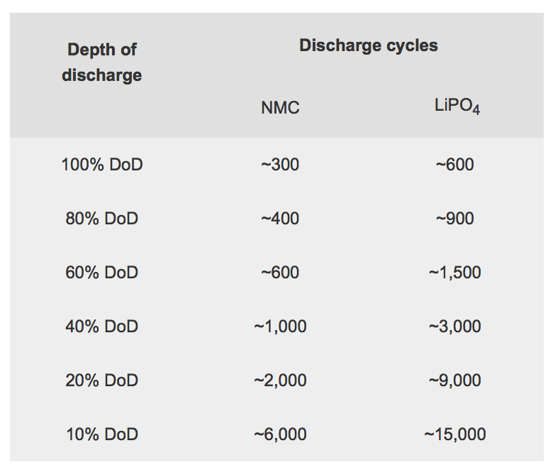 10% DoD는 전체 총량의 10%만큼 방전과 충전을 반복할 경우에 NMC 배터리(니켈망간코발트)와 리튬폴리머 배터리 헬스가 70% 까지 떨어지는 사이클 수를 정리한 표입니다.
