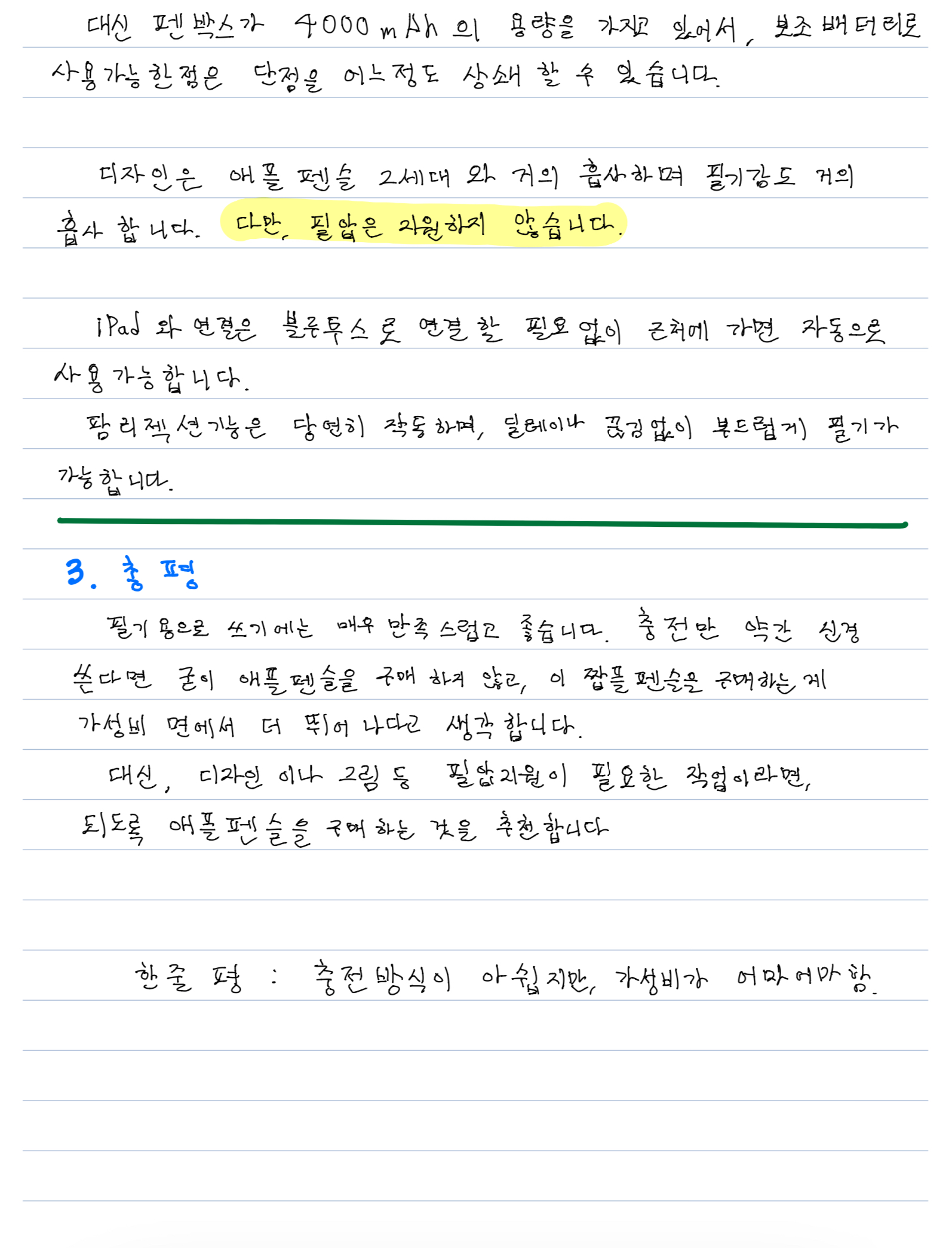 가독성이 매우 떨어지나, 짭플펜슬 사용기라 직접 필기해서 포스팅한게 좋다고 생각되서