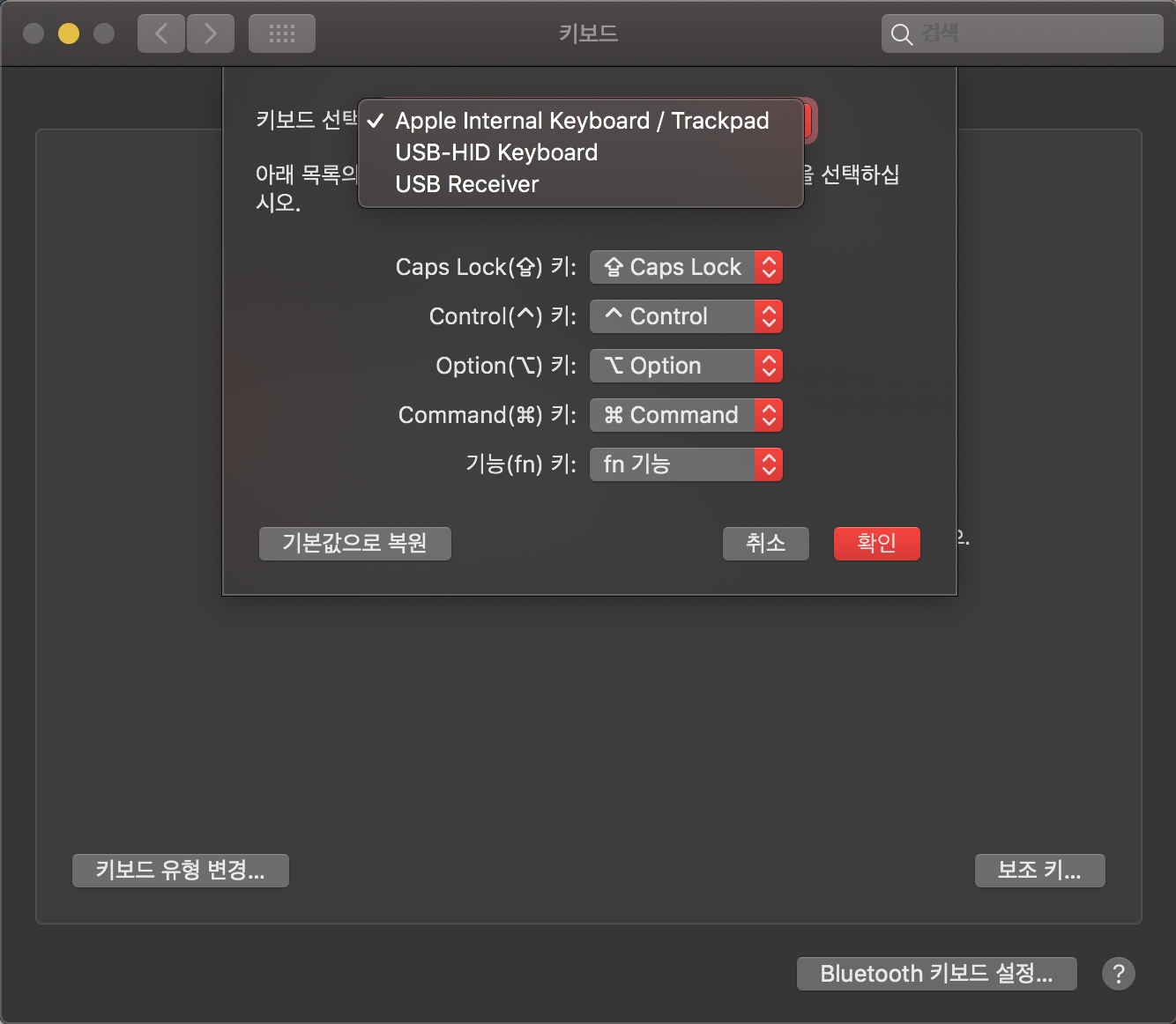 Bluetooth로 연결된 상태에서는 키보드로 인식을 하지 않아서 보조키 변경이 불가능 했습니다.
