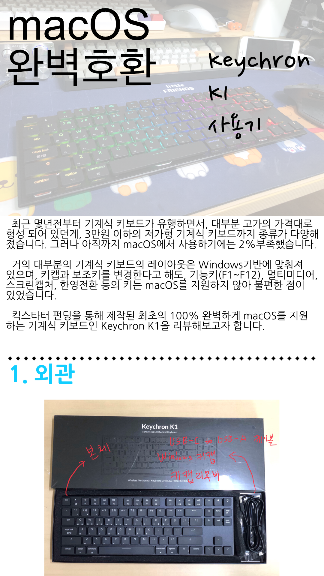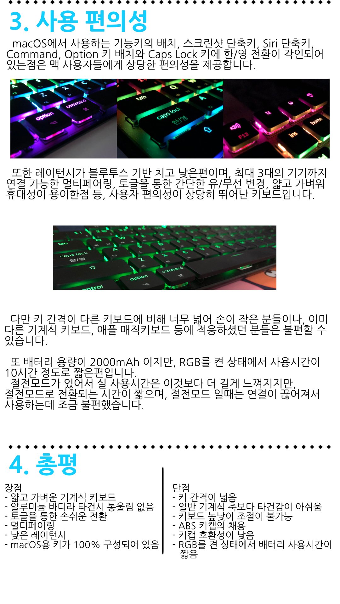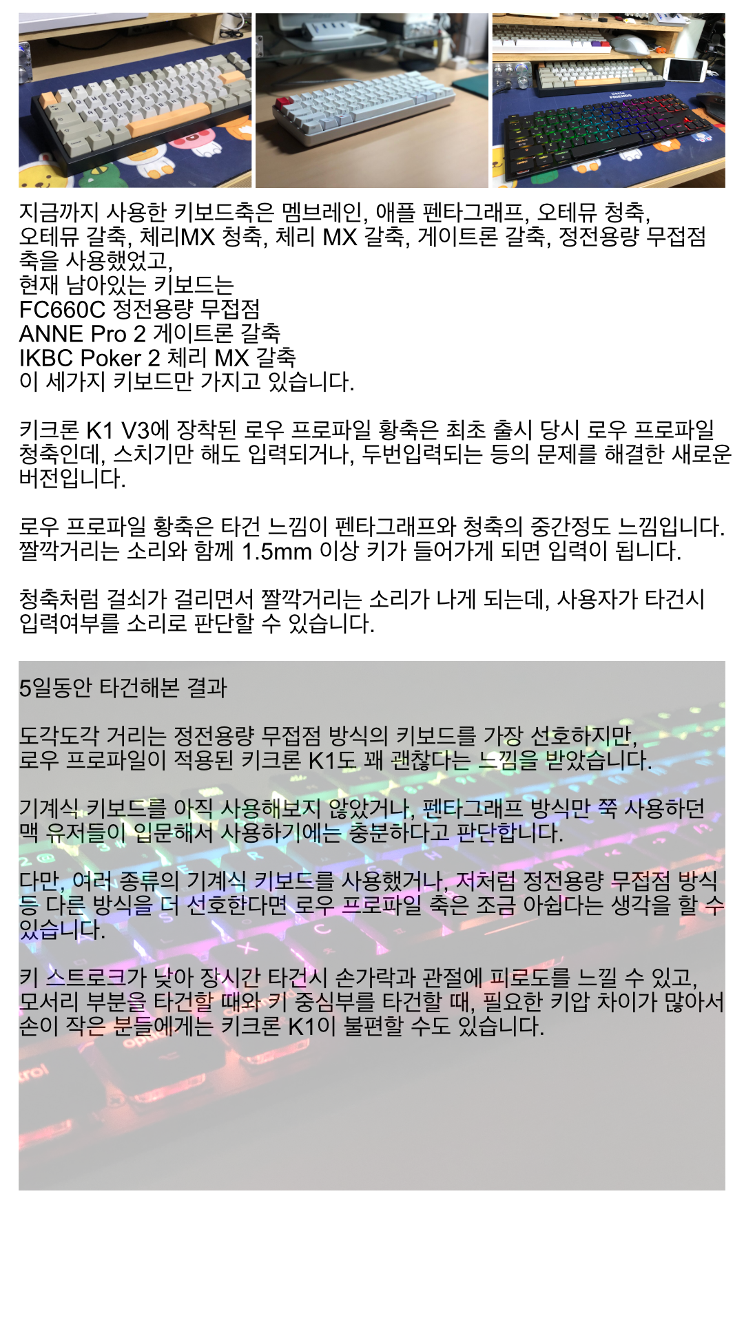 몇몇 단점이 아쉽지만, macOS를 완벽하게 지원하는 기계식 키보드인데다가, 장점이 극명한 제품이라 단점을 충분히 상쇄할 수 있다고 봅니다.