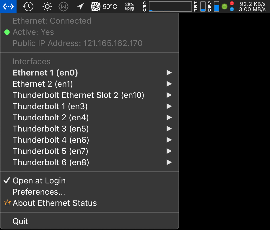 그래서 이번에 추천할 App은 macOS의 상단 상태바에 유선랜(이더넷)상태를 표시해주는 응용프로그램을 추천합니다.