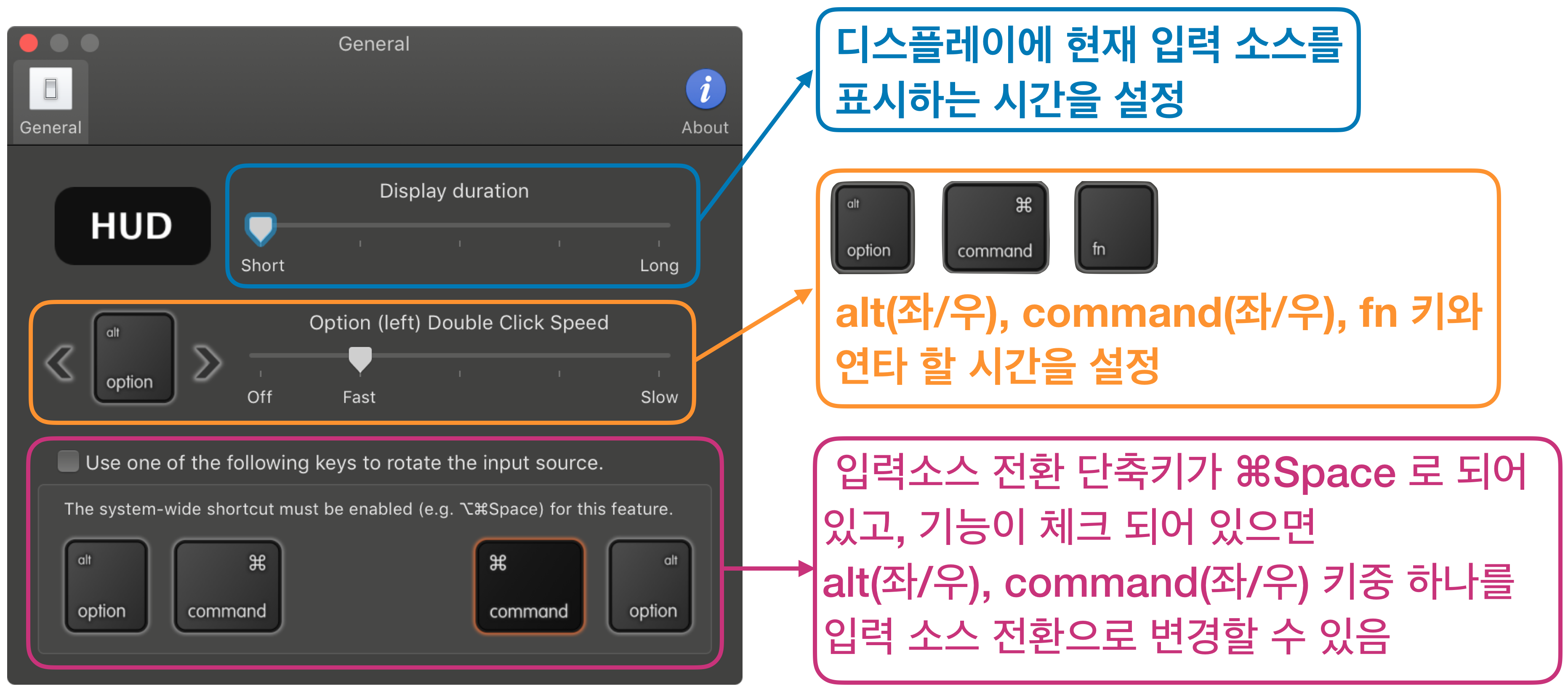 다만, 아쉬운 점은 VMware나 Parallels 등의 가상 머신에서는 해당 응용프로그램이 작동하지 않고, alt[⌥] 와 command[⌘] 두 키만 설정이 가능하고 shift나 control, caps lock 등의 다른 키는 설정이 불가능하다는 점이 있습니다.