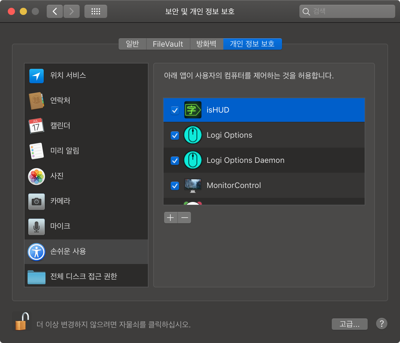 제품을 다운로드 하고, 실행하기 전에 시스템 환경설정 > 보안 및 개인정보 보호 > 개인 정보 보호 탭 > 손쉬운 사용 항목에서 isHUD를 추가해야 합니다.