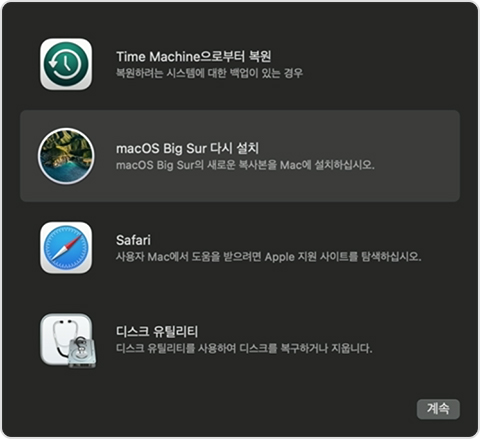 1. 단순히 운영체제만 재설치 하는 경우에는 macOS Big Sur 다시 설치를 선택합니다. 설치가 완료될 때 까지 절전모드로 전환하거나 강제로 종료하면 안됩니다.