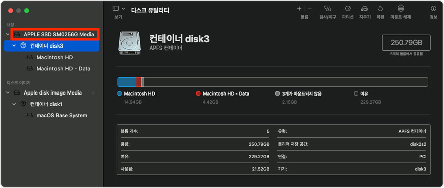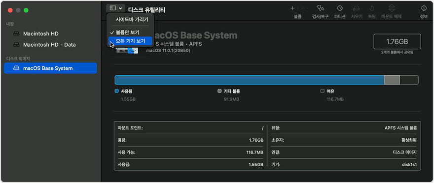 디스크 유틸리티에서 위 사진처럼 모든 기기 보기를 선택합니다.