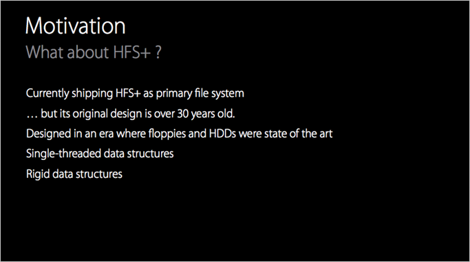 APFS(APple File System)은 2017년 3월에 iOS 10.3에 최초로 도입된 애플의 새로운 파일 포맷 시스템입니다. 기존의 HFS+ 포맷방식은 근본적으로 플로피디스크와 HDD에 초점이 맞춰진 포맷방식입니다. HFS+는 이미 출시한지 30년이 지났고, 플로피 디스크와 HDD 사용을 기반으로 제작된 포맷방식이라서 효율성이 떨어지고, 상대적으로 낮은 보안성 등, 문제점이 많았습니다.