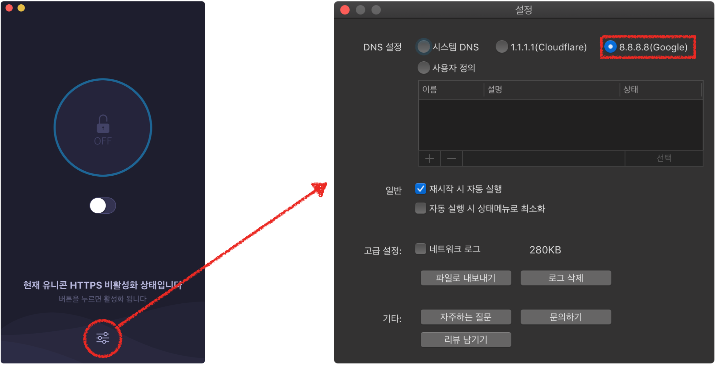 여기서 8.8.8.8(Google)을 선택하고 창을 닫은 뒤, 유니콘 HTTPS를 활성화 시킵니다.