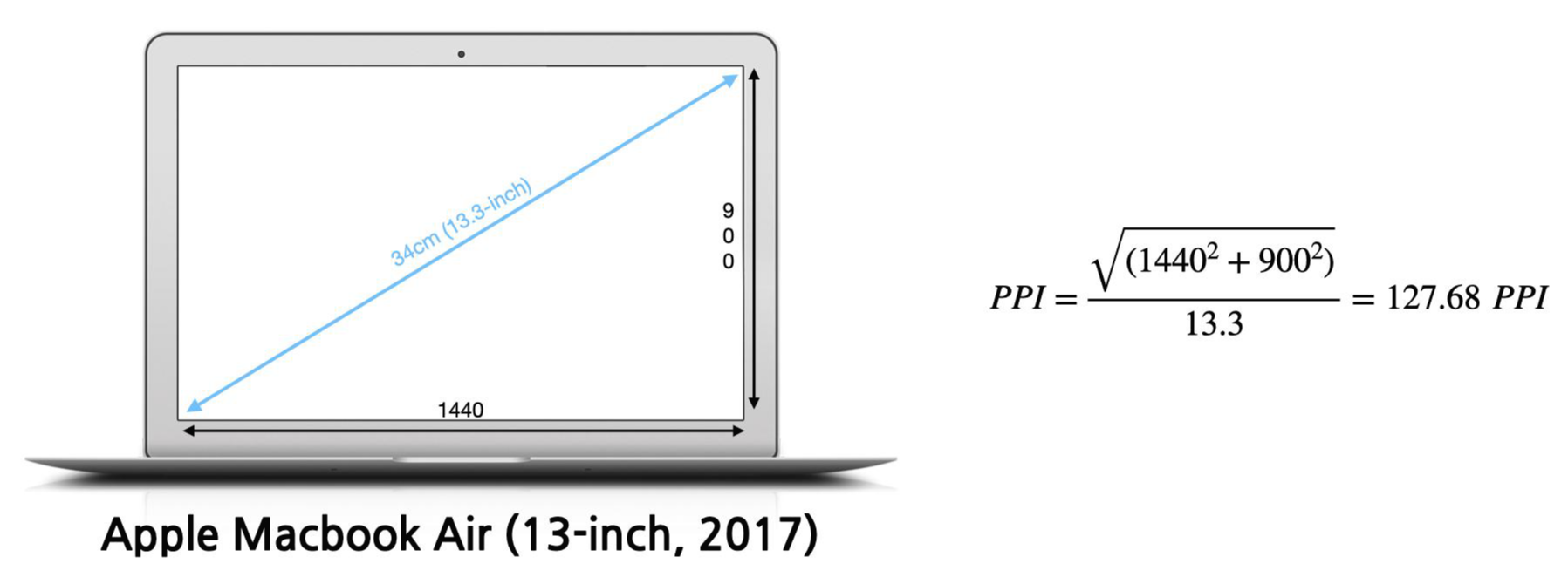 위 공식을 사용해서 맥북에어 2017년식과, 맥북프로 M1의 PPI를 계산해보면 아래와 같습니다.