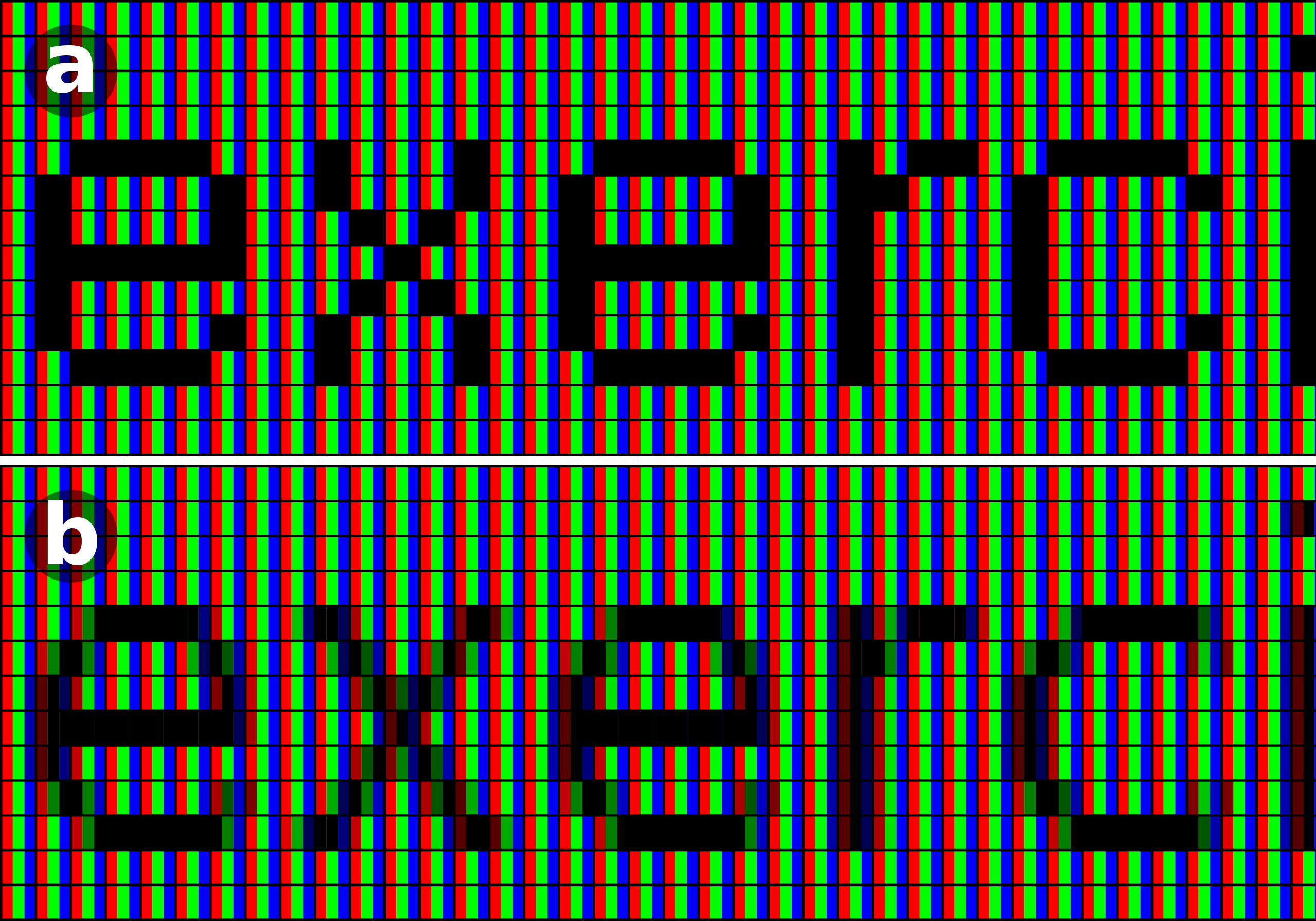 (a) 화면은 ClearType Antialiasing이 적용되지 않아서 곡선이 없이 오직 직선으로만 이루어져있음을 볼 수 있습니다. (b) 화면은 가로 방향의 ClearType Antialiasing이 적용되어서 곡선부가 부드럽게 처리되어 있음을 볼 수 있습니다. 이 화면을 일반적인 거리에서 보게 되면 실제로 곡선이 없지만 곡선처럼 보이게 됩니다.