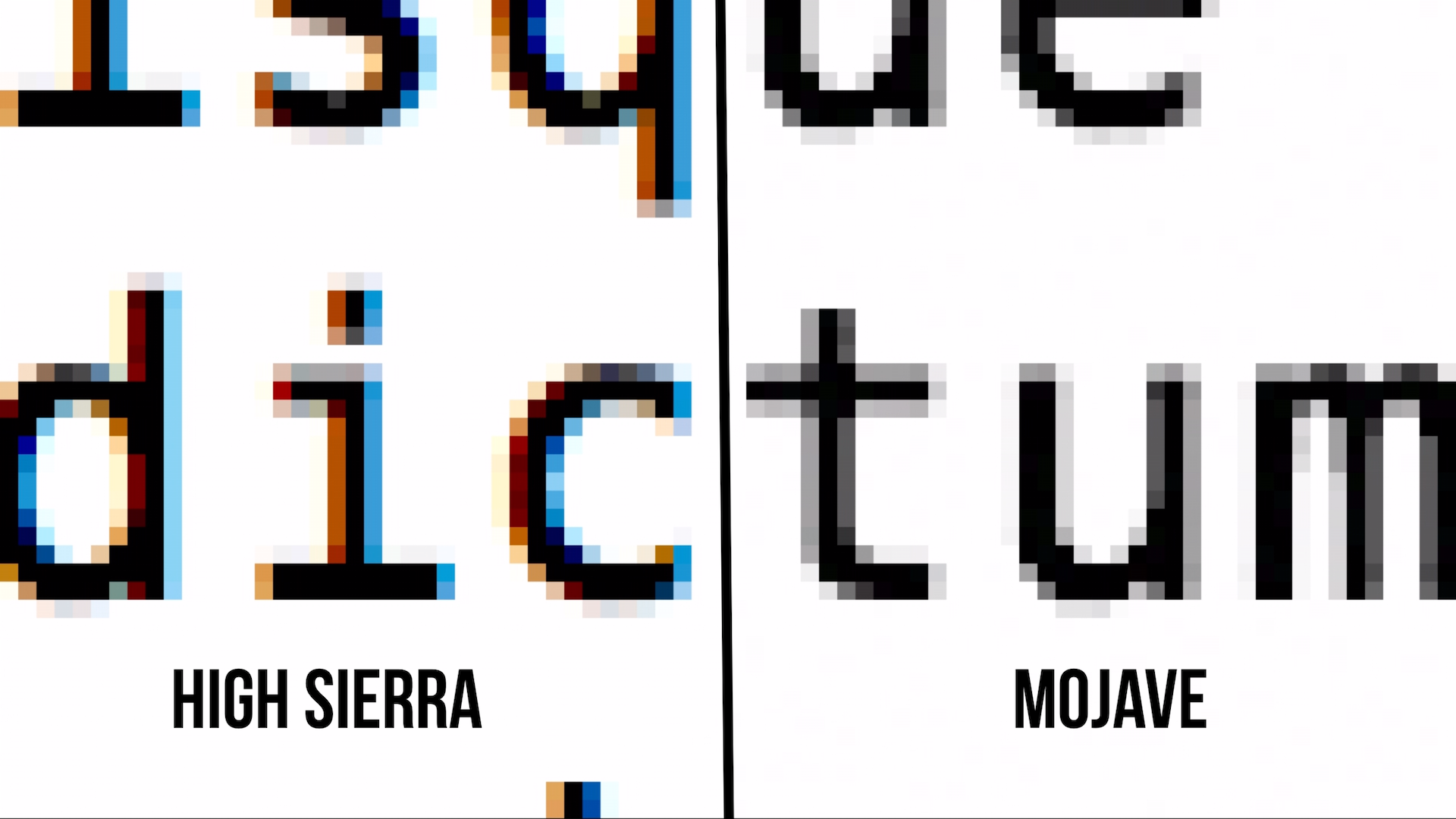 Antialiasing이 없어지면서 PPI 140 미만의 저해상도 디스플레이에 연결한 맥의 경우 폰트 가독성이 Windows에 비해 매우 떨어지는 것을 볼 수 있습니다. High Sierra 까지는 Antialiasing을 지원해서 저해상도 디스플레이에서도 나름 글자의 가독성이 나쁘지 않았는데, macOS 10.14 Mojave 부터는 글자 가독성이 기존에 비해 나빠졌습니다.