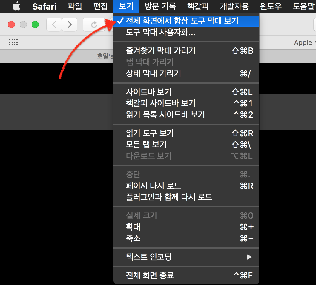 ③ 메뉴막대 > 보기 > 전체화면에서 항상 도구 막대 보기 체크 해제