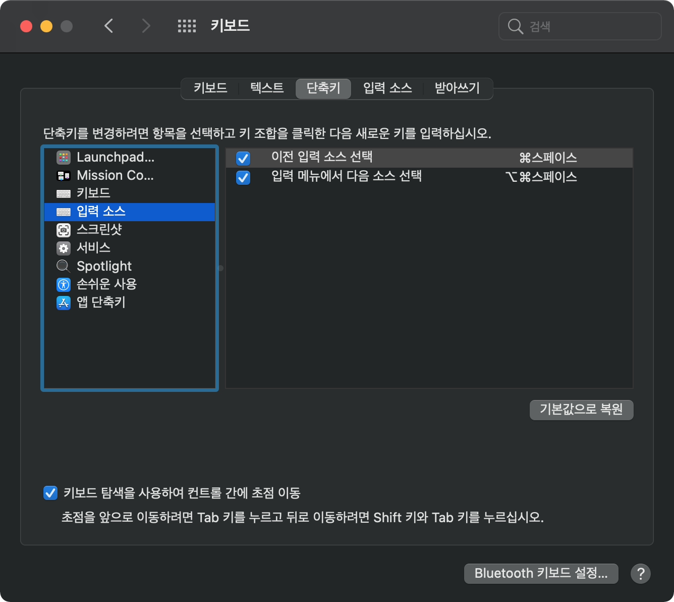 문제 없이 한/영전환을 입력하는 가장 좋은 방법은 단축키 항목의 입력소스 에서 이전 입력 소스 선택 단축키를 입력하는것 입니다. 저는 2009년도 부터 사용해와서 Command+Space Bar의 조합을 지금까지 계속 사용중입니다. iPadOS와 같이 사용하시는 분들은 주로 Control+Space Bar를 사용하며, Karabiner 를 사용하여 자주 사용하지 않는 우측 Command 키의 기능을 없애고 한영전환 키로 사용할 수도 있습니다. 손쉽게 한영전환 하는 방법은 아래 링크를 참고하시기 바랍니다.