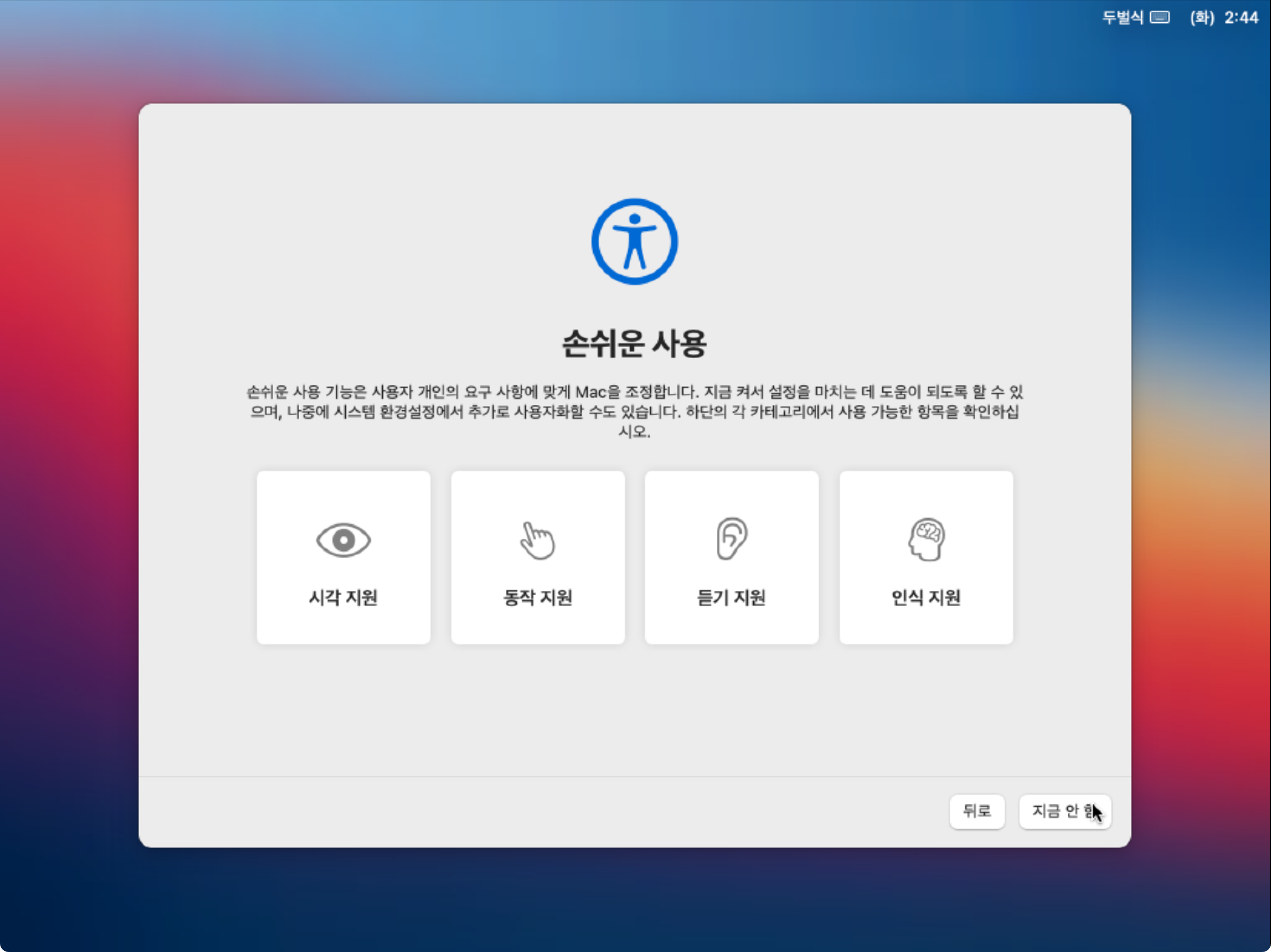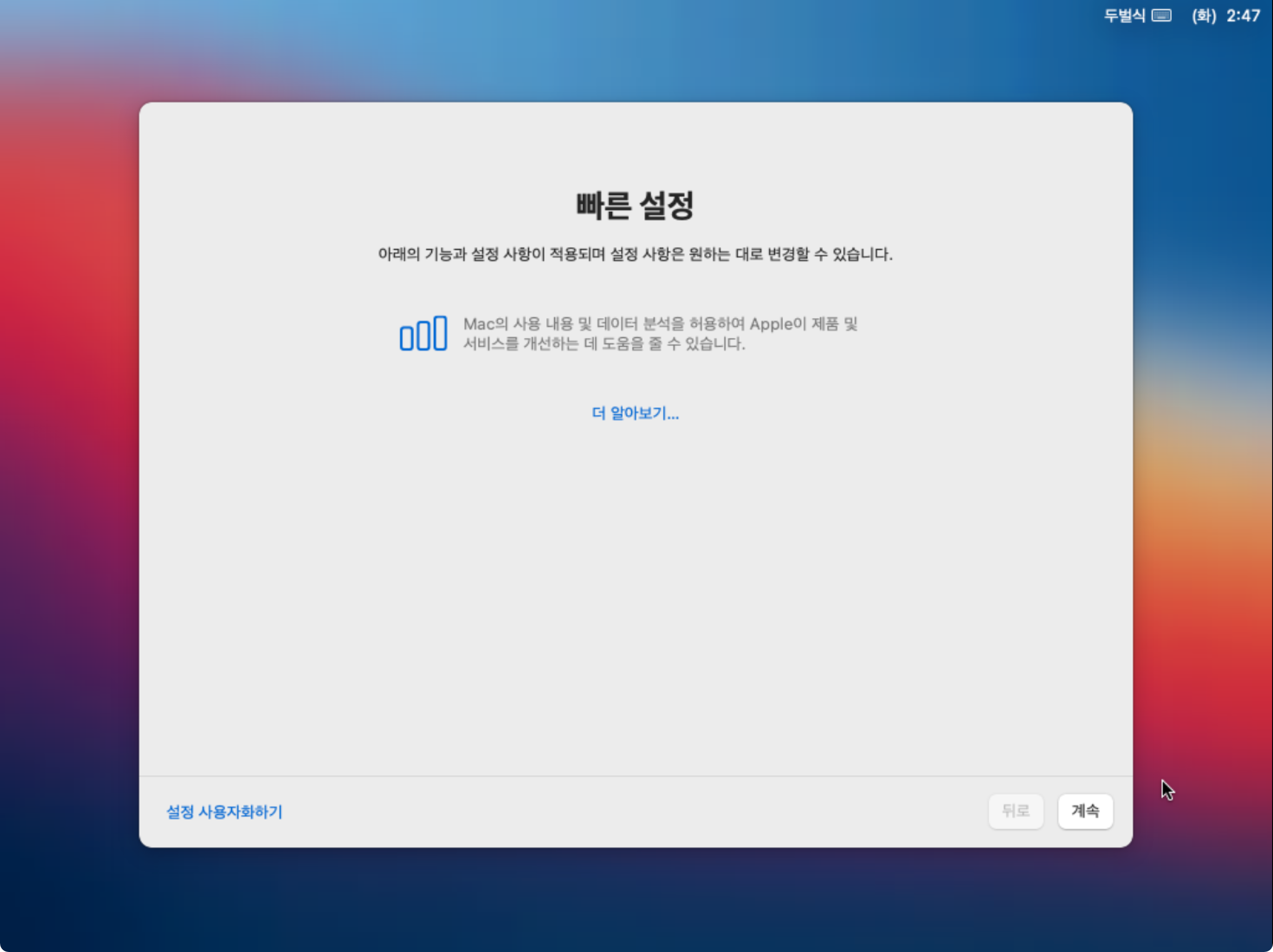 빠른 설정은 그냥 넘어가도 괜찮습니다. 모든 설정은 시스템 환경설정을 통해 추후 사용자가 따로 설정할 수 있습니다.