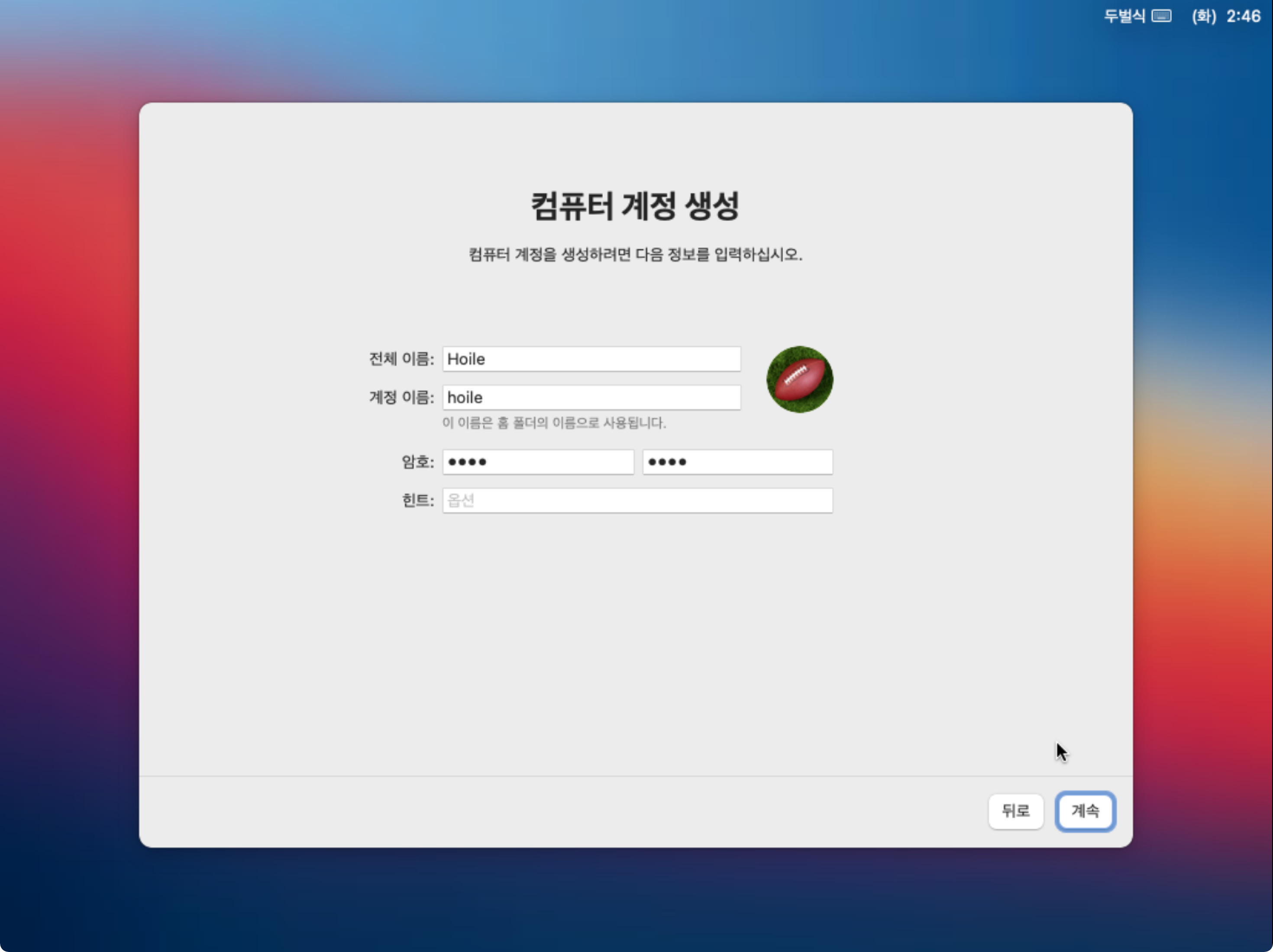 전체 이름을 입력하면 계정 이름이 알아서 입력됩니다. 이 때 전체 이름을 한글로 하는 경우가 종종 있습니다. 전체 이름 및 계정 이름은 되도록 영문으로 작성하는게 추후 매우 이롭습니다. 기본적으로 영문이나 숫자의 경우 1글자를 1바이트 문자라 터미널이나 각종 고급 프로그램 또는 기타 프로그램 사용 등에 문제가 생길 여지가 없습니다. 그러나 한글의 경우 2바이트 문자라 일반적인 사용에는 문제가 없으나, 추후 계정이름 변경부터 터미널 사용 등에서 문제가 발생할 수도 있으니 되도록이면 전체 이름을 영문으로 설정하시기 바랍니다