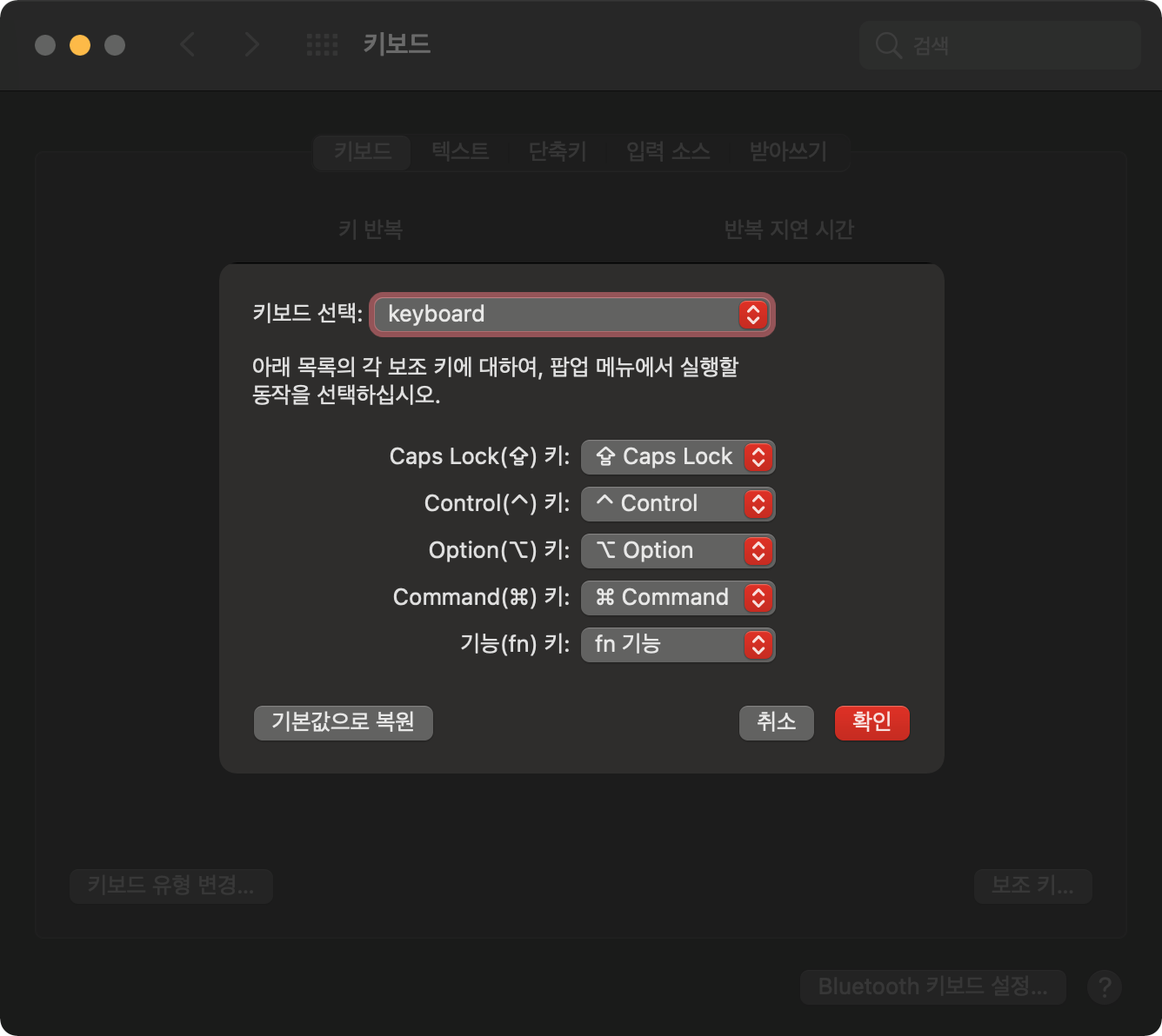 만약 Windows 기반 키보드를 사용한다면, 우측 하단의 [보조 키...] 항목에서 Control, Option(Alt),Win(Command), CapsLock,Fn 총 5개의 보조키 위치를 사용자가 원하는 대로 설정할 수 있습니다.