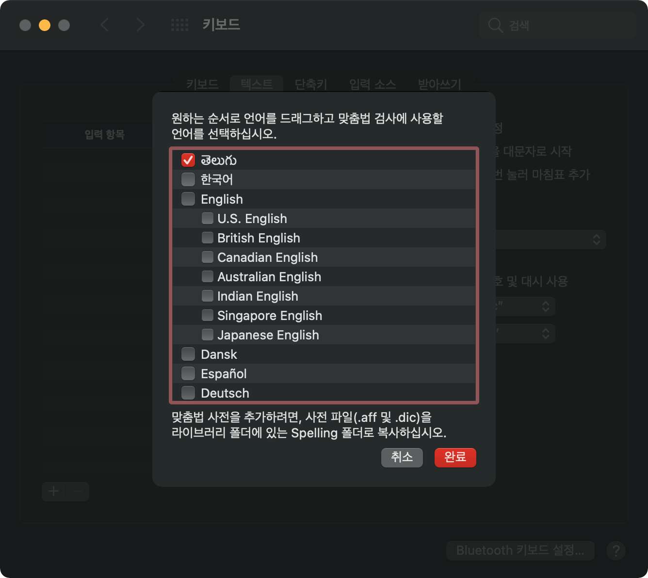 맞춤법 해제는 맞춤법에 있는 언어를 클릭 후 가장 아래로 가면 설정이 있습니다. 거기서 가장 사용하지 않을 언어를 체크 후 최상단으로 올리고, 한국어와 English는 체크 해제 후 완료를 누르시면 됩니다.
