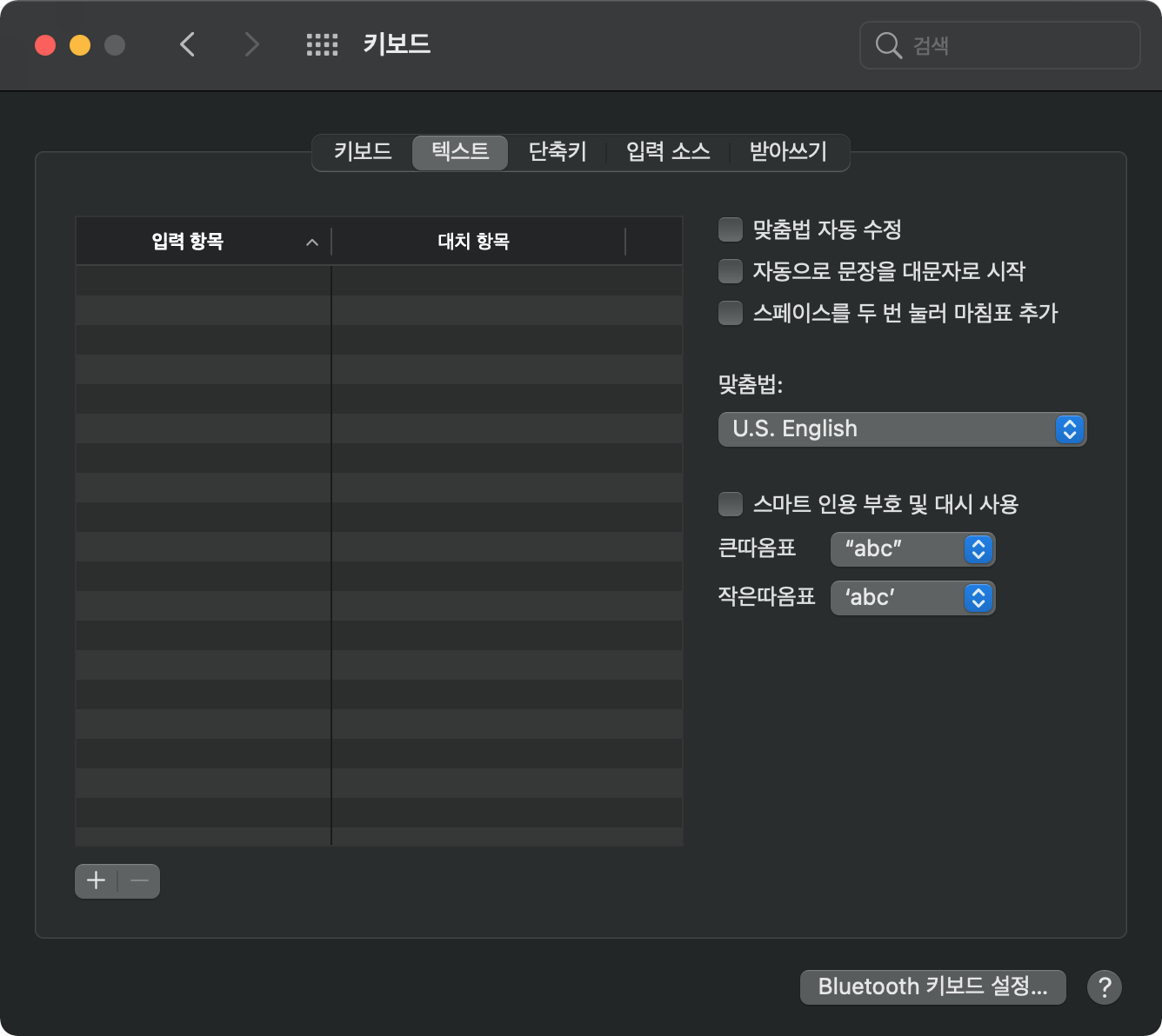 두번째 항목인 텍스트는 간단한 입력으로 미리 설정해둔 대치 항목의 텍스트가 바로 입력되게끔 설정하는 것과, 맞춤법 및 자동 대문자 설정 등의 항목이 있습니다. 여기서 다른 기능은 원하는 대로 다 사용하셔도 되지만, 맞춤법 자동수정은 반드시 끄고, 한국어와 영어의 맞춤법을 모두 해제하시기 바랍니다.