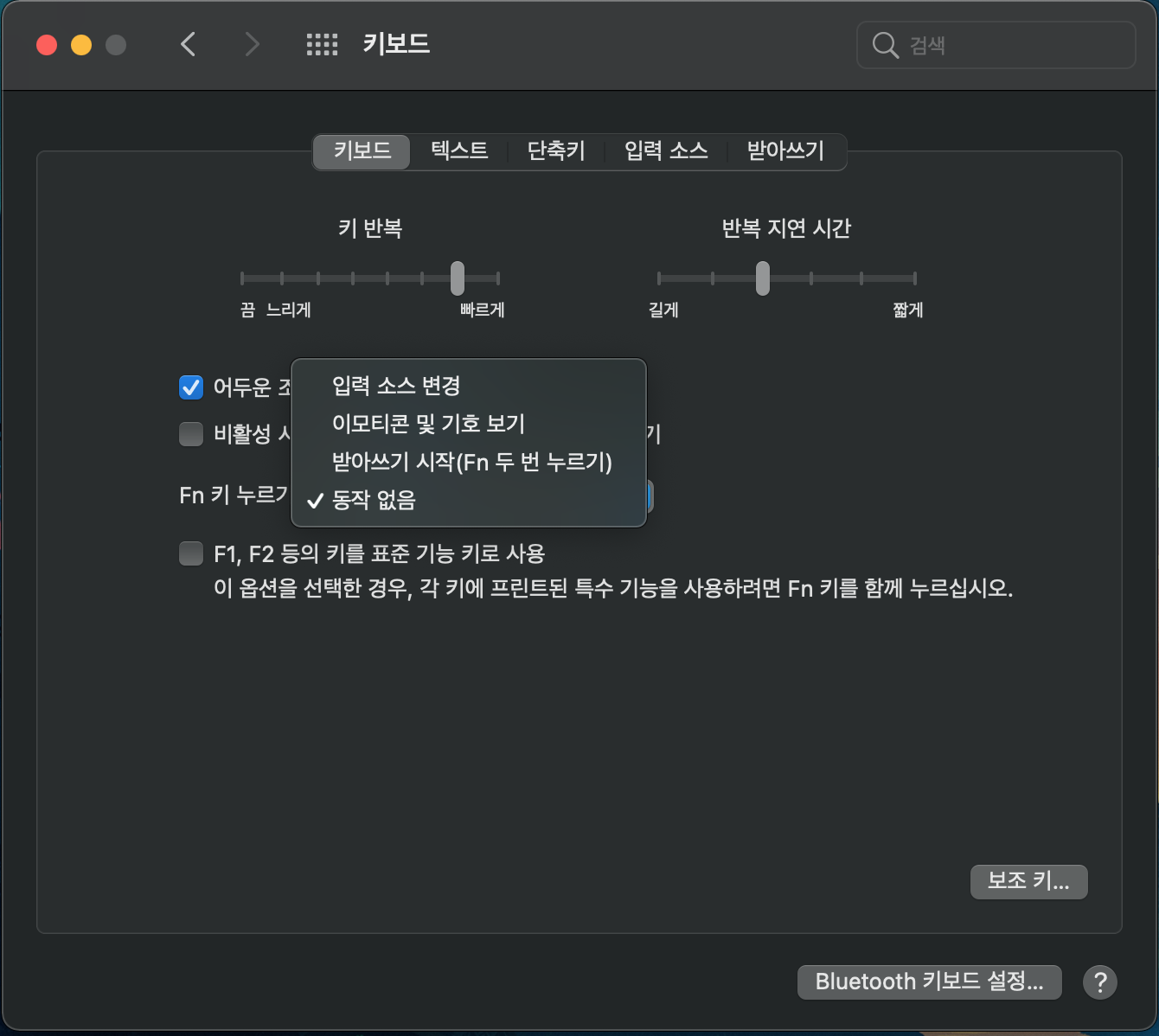 키보드 설정창의 기본입니다. 키 반복과 반복 지연시간, 키보드 백라이트, Fn 키 설정 및 F1 부터 F12 까지의 기능키를 표준 기능키로 사용할 건지, macOS의 하드웨어 제어키로 사용할 건지를 사용자가 설정할 수 있습니다.