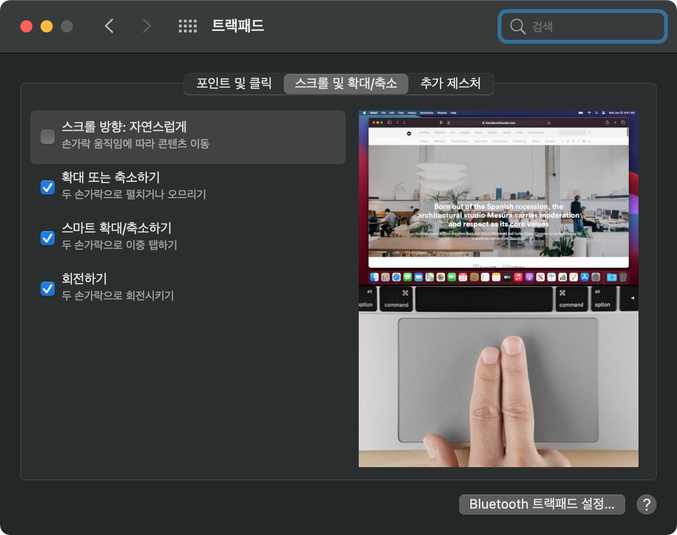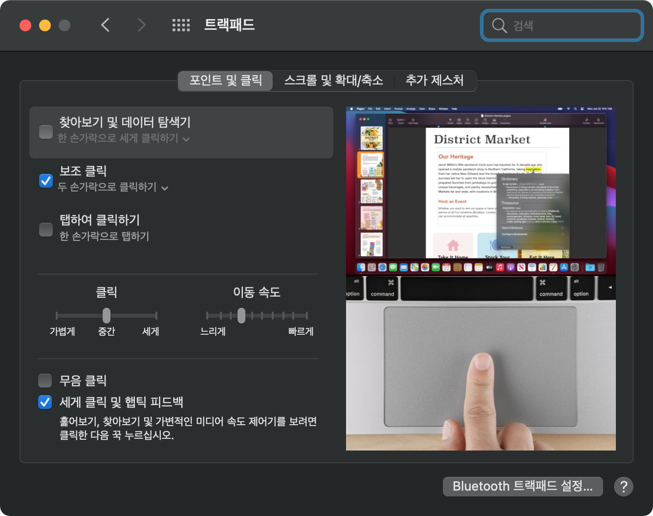 맥을 구매하는 이유중 꽤 큰 비중을 차지하는 트랙패드 입니다. 트랙패드 설정은 각 항목마다 우측에 작동 예시를 보여주기 때문에 글로 된 설명을 읽는 것보다 작동 예시를 보고 원하는 대로 설정하는 것이 더 빠르고 정확합니다.