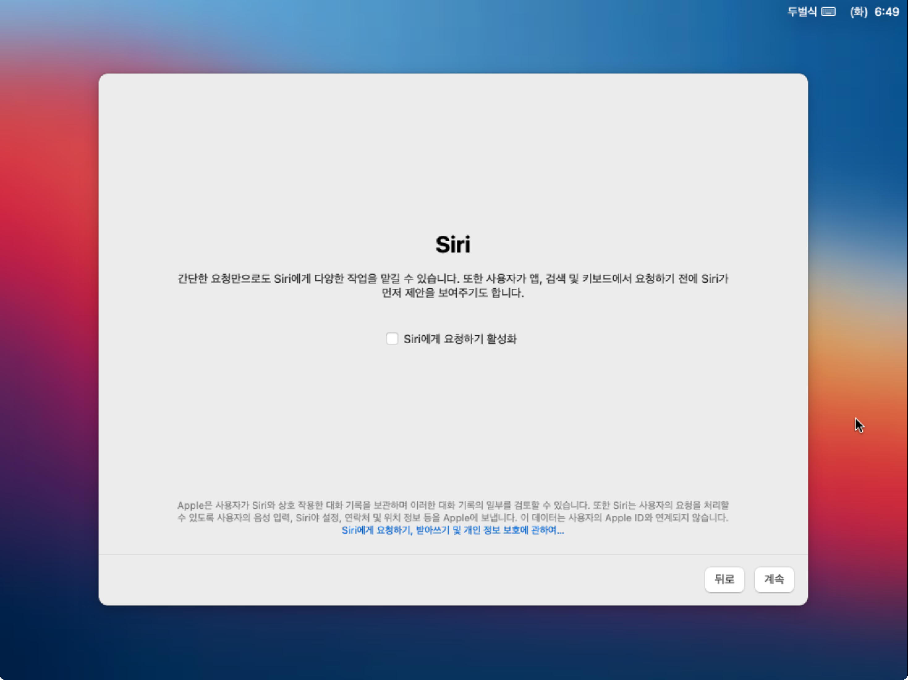 저는 맥프로(6,1)을 사용하고 있어서 별도의 마이크가 없어 SIri가 활성화되지 않으나, 맥북에어와 맥북프로, 아이맥의 경우 내장 마이크가 있어서 Siri 활성화가 가능합니다. iPhone이나 iPad 에서 Siri를 자주 사용했다면 macOS에서도 켜서 사용해 보는것도 나쁘지 않으나, 한국어에서는 그리 원활하게 작동되지는 않아서 딱히 추천하지는 않습니다.