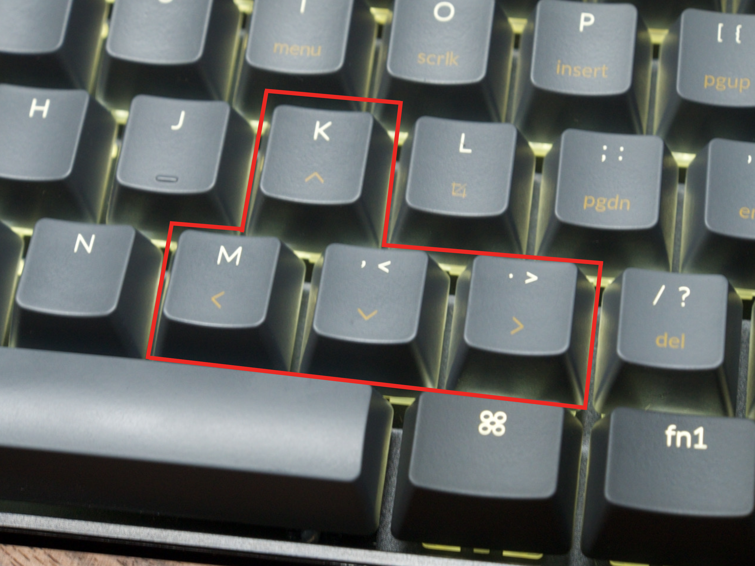 하지만 보통의 방향키와 달리 윗방향키가 너무 좌측으로 쏠려 있어, 기존 방향키가 있는 키보드 사용자가 적응하기에는 배열이 너무 어색합니다. 또 기존의 61Key 키보드 사용자들이 WASD 조합으로 사용하다가 완전히 새로운 방식인 KM,. 배열로 다시 적응하기도 애매합니다.