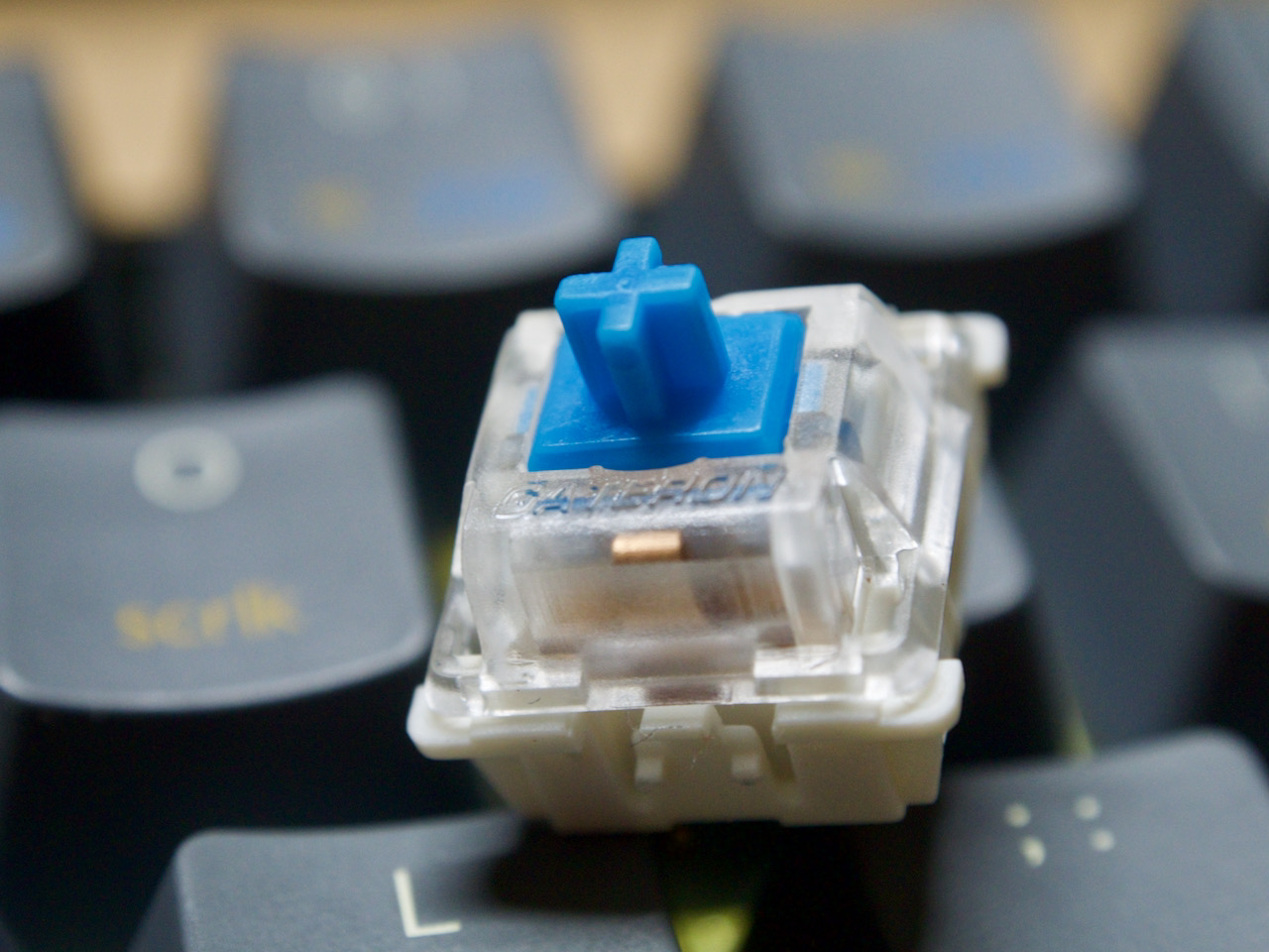 제공받은 키보드의 스위치는 게이트론 청축입니다. 체리 MX호환 스위치 종류중 하나인 게이트론 스위치는 현재 모든 키크론 키보드 제품에 사용되고 있습니다. 체리 MX 호환 스위치라 체리축만큼 정교하고 안정적인 타건감을 제공하지는 않지만, 게이트론 정도면 무난하게 사용이 가능하다고 생각됩니다. 물론 게이트론에서 마니아 층있는 제품은 리니어인 게이트론 황축이나 게이트론 흑축이 유명합니다. 게이트론 청축이 안좋은 제품은 아니지만 체리 청축에 비해서는 여전히 아쉽습니다. 체리 청축과 메커니즘은 완전히 동일하나, 스위치가 올라오면서 스위치의 상단 하우징(속칭 뚜껑)을 때리는 느낌과 소리가 체리청축에 비해 심하게 느껴집니다. 기본적으로 장착된 스위치는 단가가 조금 높아지더라도 체리MX 축이나 호환축 중에서는 평이 가장 좋은 카일 축을 사용했더라면 더 좋았을 것 같습니다.