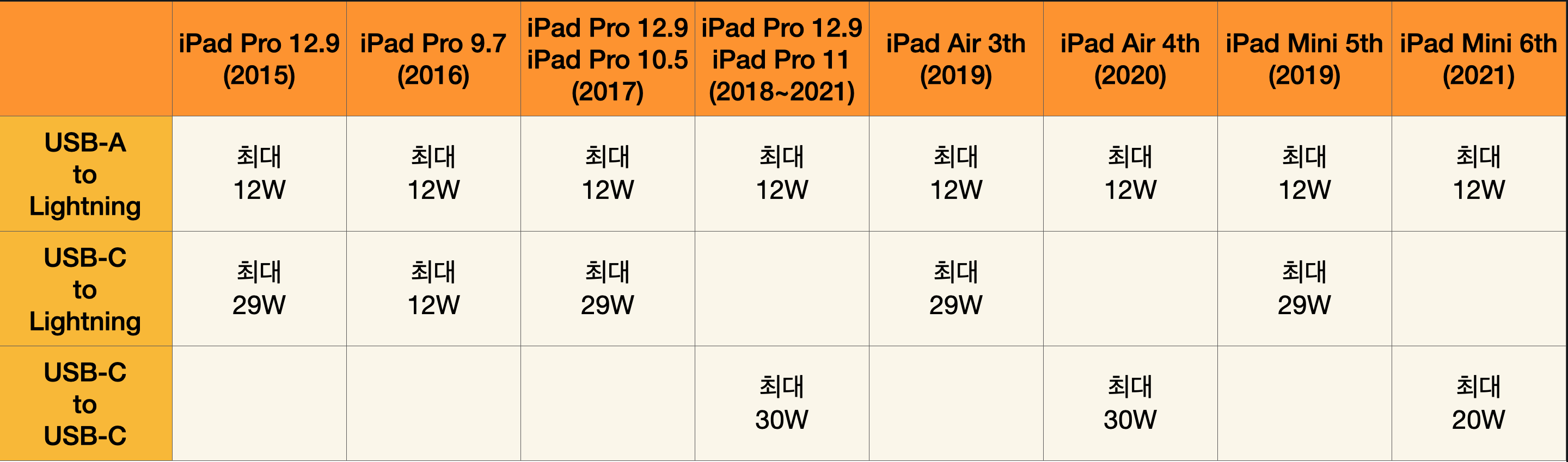 고속충전을 지원하는 모델은 라이트닝 포트를 탑재한 모델과 USB-C를 탑재한 모델에 따라 다른데 아래 표에 따라 고속 충전 여부와 속도를 정리했습니다.