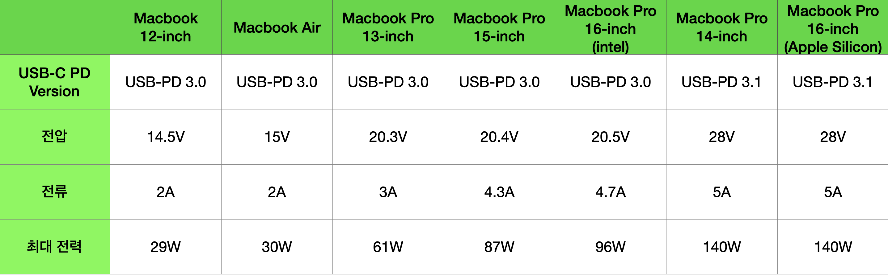 신형 맥북프로 14인치와 16인치 모델의 경우 USB-PD 3.1을 지원해 140W를 지원하는 충전기를 구매하는게 가장 좋습니다. 이외 다른 맥북의 경우 USB-PD 3.0 100W 를 지원하는 충전기를 구매하면 기종에 상관없이 적정 전압/전류값이 자동으로 맞춰저 최대 전력값으로 충전이 가능합니다.
