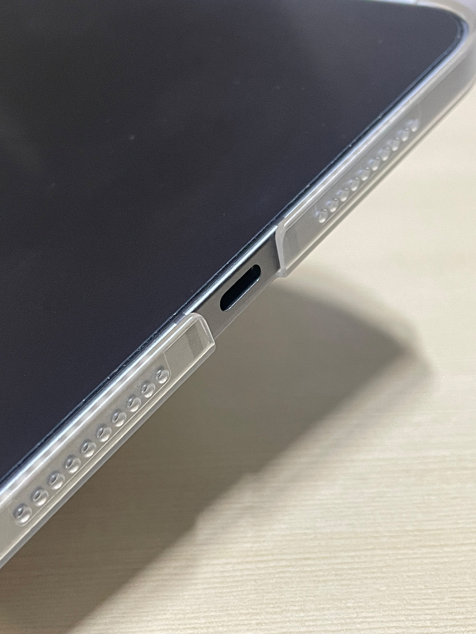 애플 펜슬 2 부착부분과 USB-C, 지문인식 및 전원 버튼은 개방되어 있고 나머지 부분은 막혀있습니다. 애플 펜슬 2를 사용하지 않는 사람들에게는 오른쪽이 완전히 개방되어 있어서 좀 불안할 수 있다고 생각합니다. 그러나 대부분 아이패드를 구매하시면 애플 펜슬 또는 짭플 펜슬을 구매해서 사용하는 경우가 대다수라 부착부분이 뚫려있는게 오히려 더 좋다고 생각합니다.