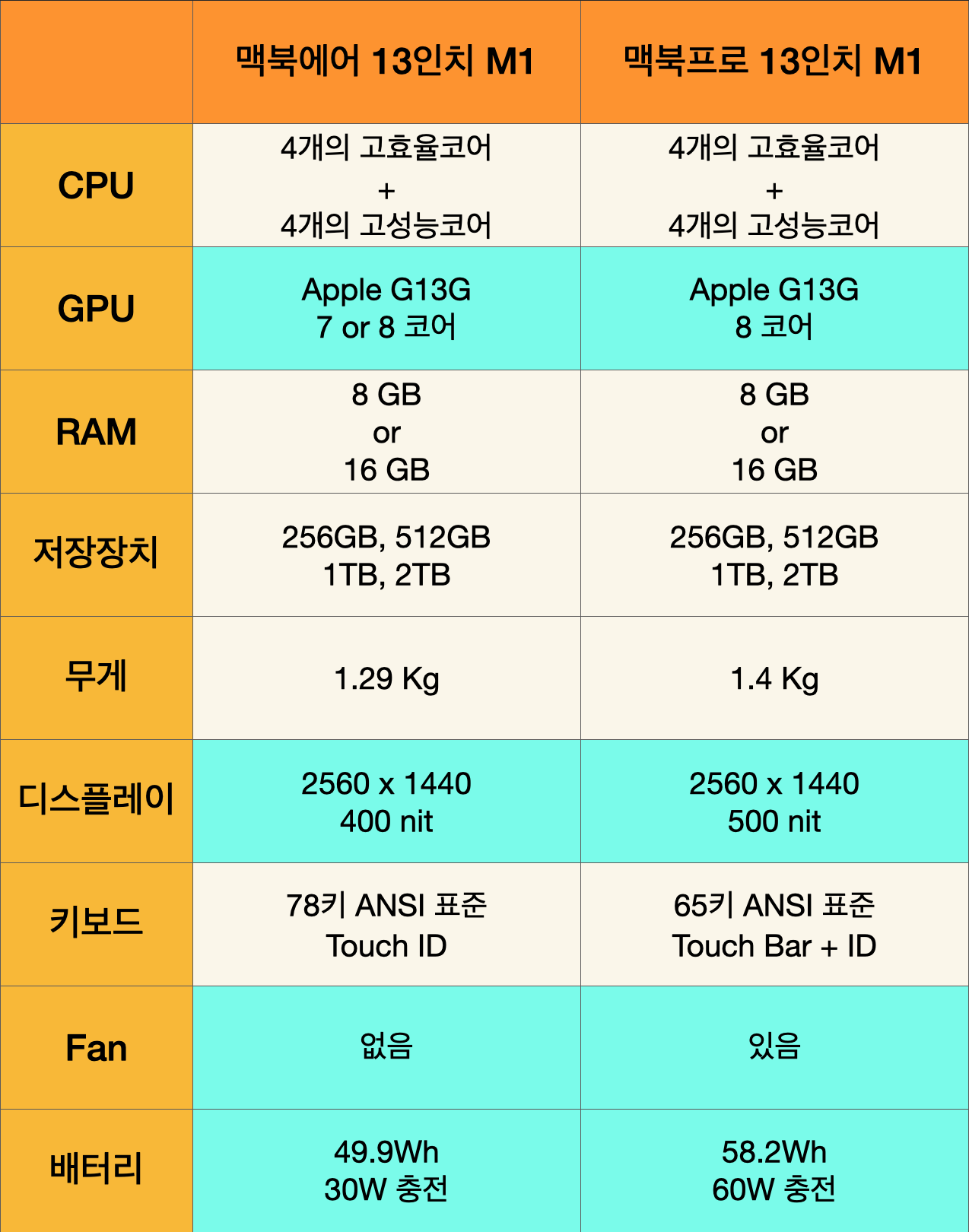 라이트 유저가 맥에 입문하는데 가장 고민하는 부분이 바로 맥북에어와 맥북프로중 어떤 제품을 구매하느냐 입니다. 인텔 CPU를 탑재하고 있었을 때는 맥북에어와 맥북프로는 CPU의 성능이 확연이 차이나서 알아볼 내용이 많지 않았으나, 애플 실리콘 M1 칩을 탑재한 맥북에어 13인치 모델과 맥북프로 13인치 모델은 동일한 M1을 탑재했습니다. 컴퓨터에 관한 지식이 많지 않거나, ARM64를 구동하는 애플실리콘 칩을 제대로 이해하고 있지 않다면, 두 모델간의 차이점을 알기 어렵습니다.