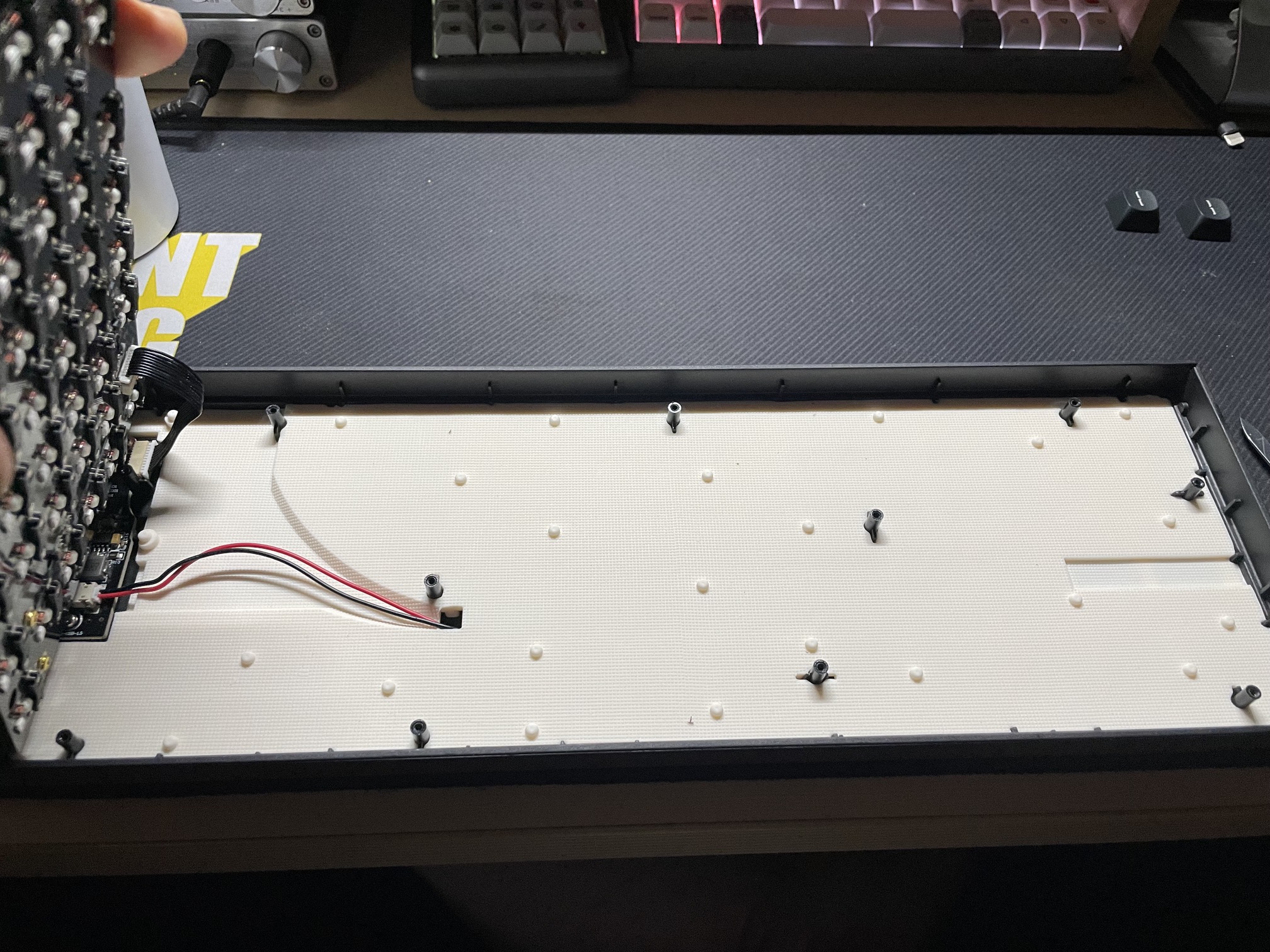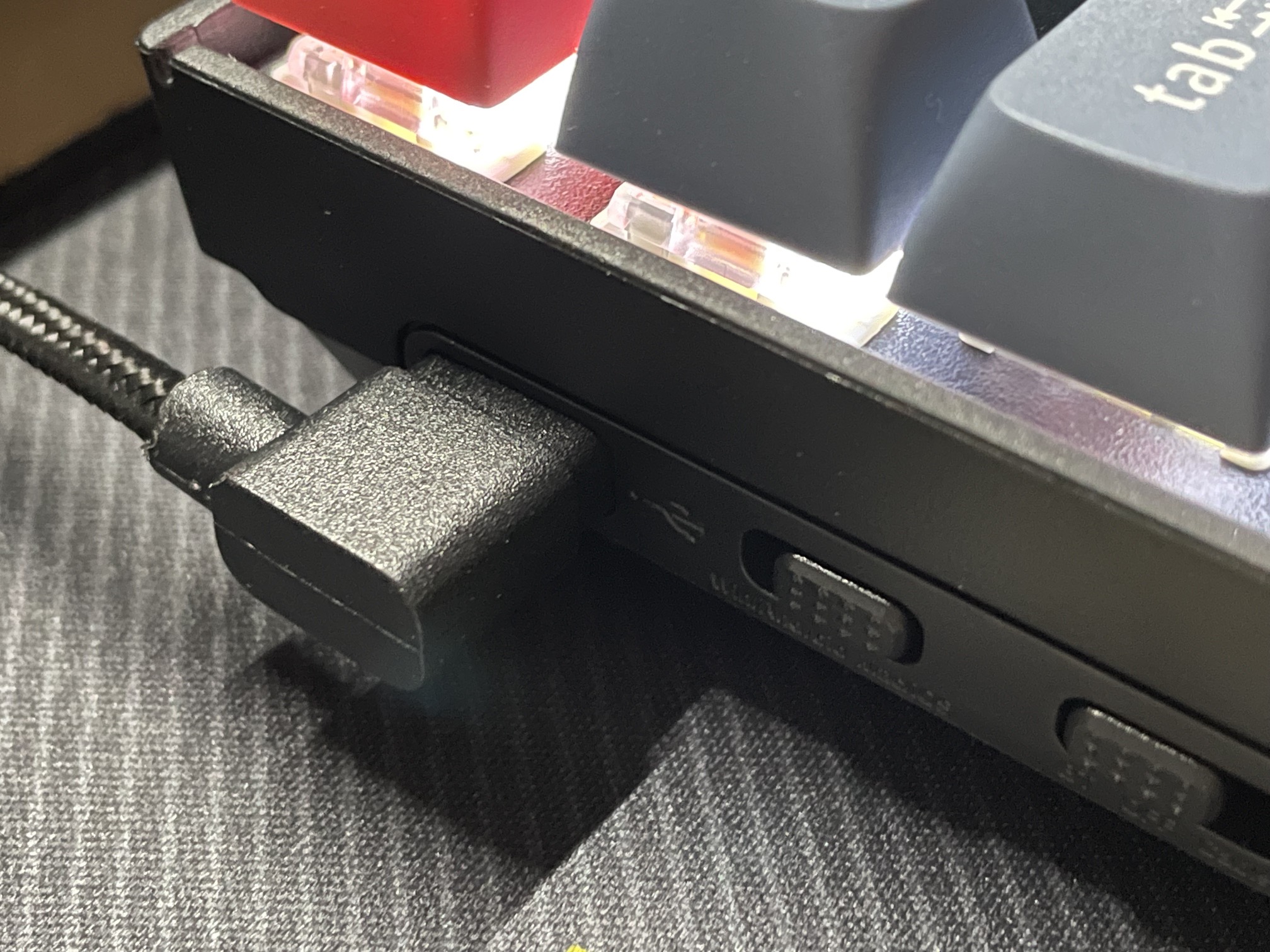 약 1cm 정도 되는 흡음재가 들어가 있어, 통울림이 전혀 없고, 묵직한 무게 덕분에 확실히 이전 제품들에 비해 타건감이 월등히 좋아졌습니다. 이전 모델들은 기능에는 충실했지만 키보드 자체의 타건감은 저렴한 키보드랑 같아서 딱히 추천하기는 어려웠습니다. 그러나 프로모델은 타건감까지 좋아져서 기계식 키보드에 입문하는 유저나, 좀 더 좋은 기계식 키보드를 찾고있는 매니아층에게도 추천할 만한 키보드가 되었습니다.