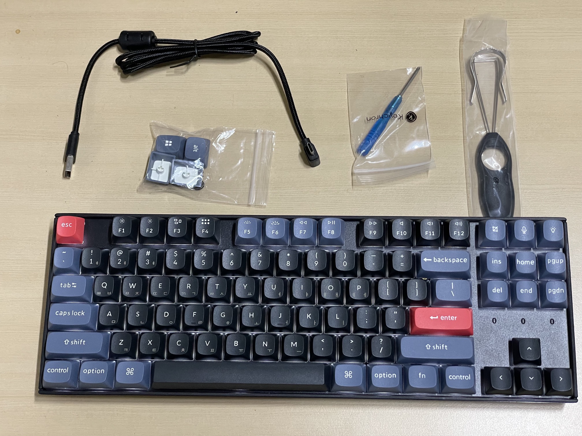 키크론 키보드의 구성품은 항상 동일해왔습니다. 이번 K8 PRO 역시 키보드 본체, USB 케이블, 키캡 리무버, Windows용 여분 키보드가 동일하게 들어가 있고, 특이하게도 십자드라이버가 포함되어 있습니다. 핫스왑 방식이라 십자드라이버 대신 스위치 리무버를 제공했으면 조금 더 좋았을 것 같습니다.