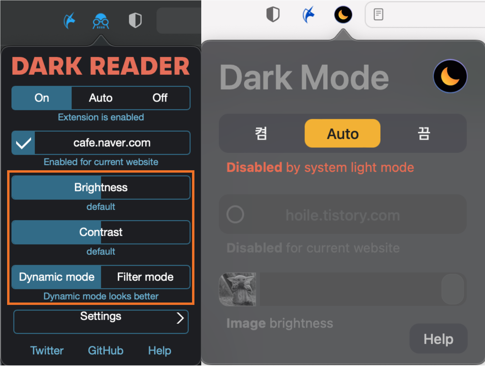 다만 아쉽게도 Dark Reader는 밝기와 컨트라스트 조절이 가능하고, 다이나믹 모드와 필터 모드를 통해 사용자가 원하는대로 조절이 가능하지만, Neo Noir는 이미지의 밝기만 조절하고 나머지는 고정된 색상으로만 사용이 가능합니다.