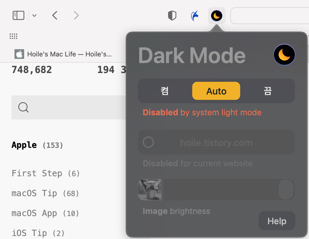 저는 메인 기기는 다크모드, 서브 기기는 라이트 모드를 사용하고 있어서 현재 비활성화가 되어 있습니다. 다크모드를 활성화 하기 전에 우선 모든 웹사이트에 읽기 권한을 부여해야 합니다. 프로그램이 해당 웹사이트를 바로 다크모드로 전환하기 위해 권한을 부여하는것 일 뿐 개발자가 사용자의 데이터를 수집하지 않으니 개인정보 유출 걱정없이 사용 하시면 됩니다.