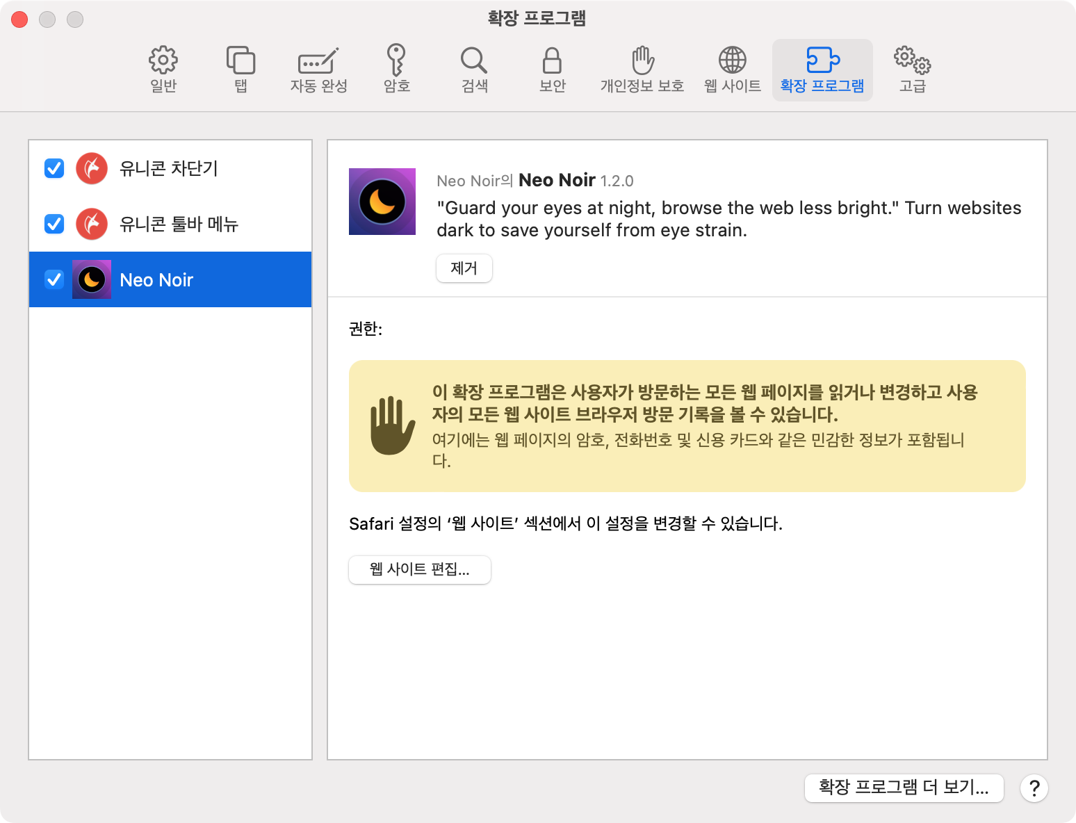구매 후 사파리 환경설정 > 확장 프로그램 에서 Neo Noir를 체크해서 활성화 하면 됩니다.