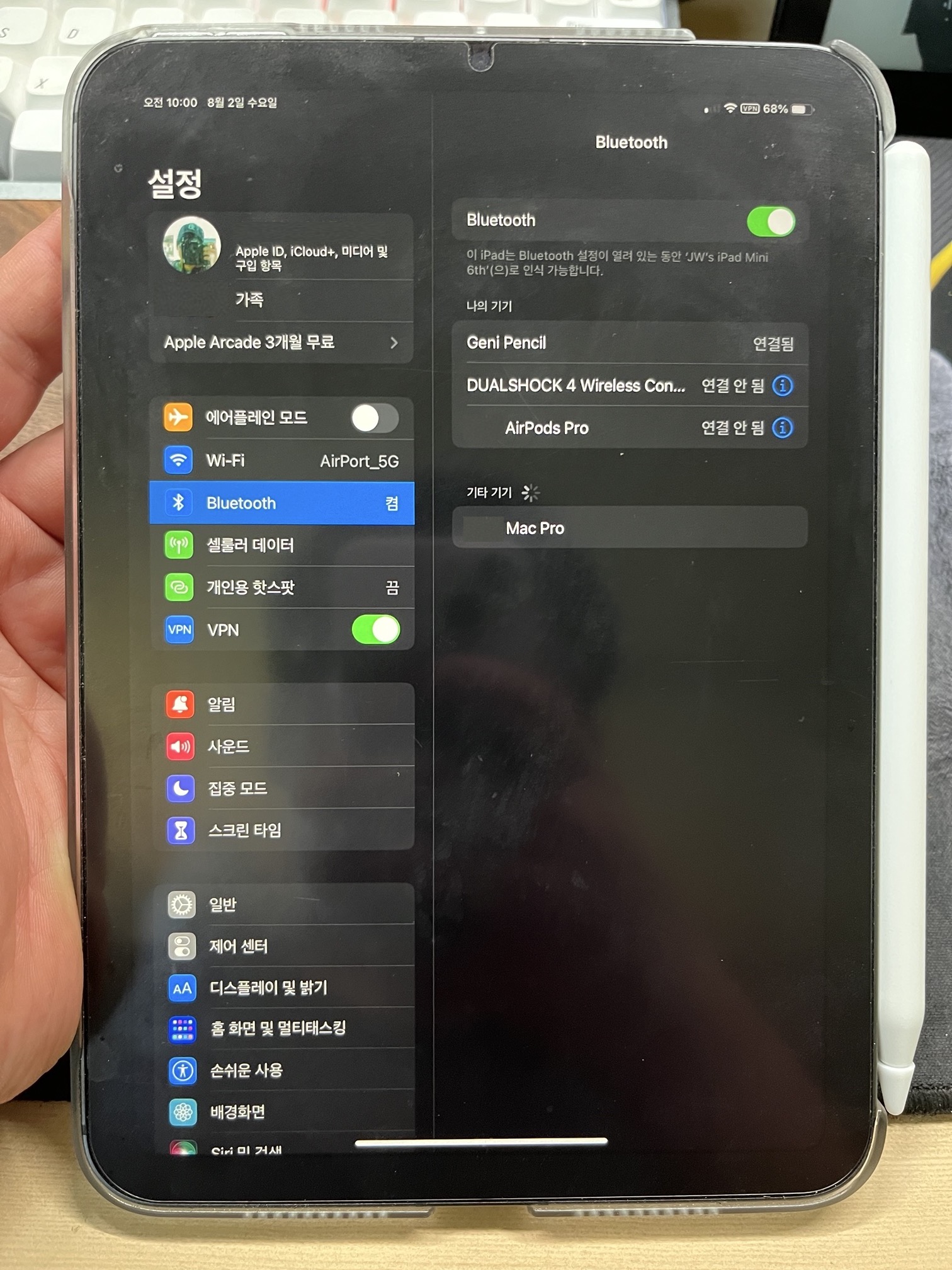 연결은 아이패드의 블루투스 항목에 가면 기타 기기에 Geni Pencil 이라고 나옵니다. 블루투스로 바로 연결이 가능합니다.