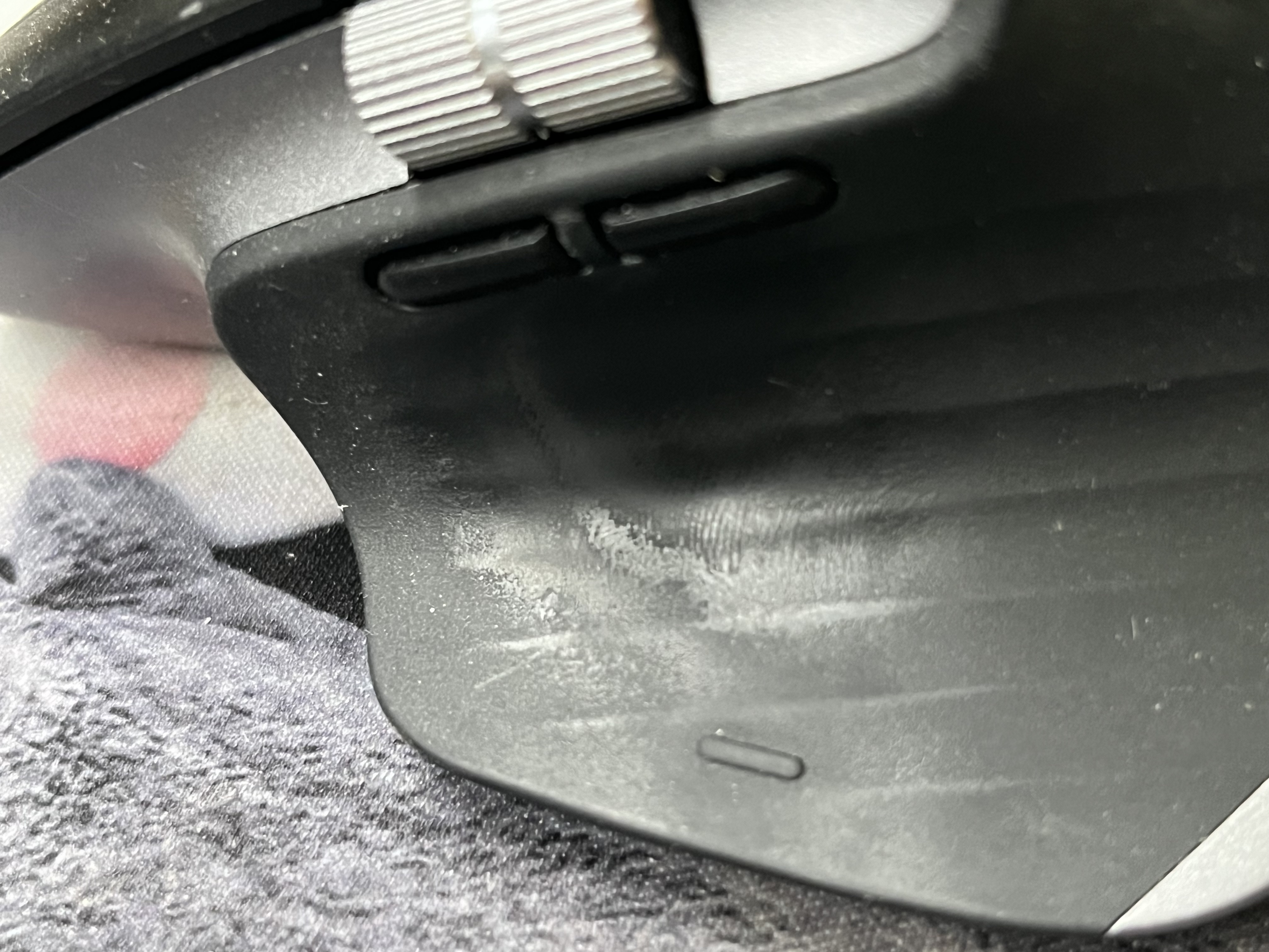 약 2년정도 사용한 로지텍 MX master 3s 입니다. 플래시를 사용하지 않고 찍었음에도 불구하고, 틈새에 먼지가 많이 들어가 있고, 우측부분에 변색이 진행되고 있는 상태입니다.